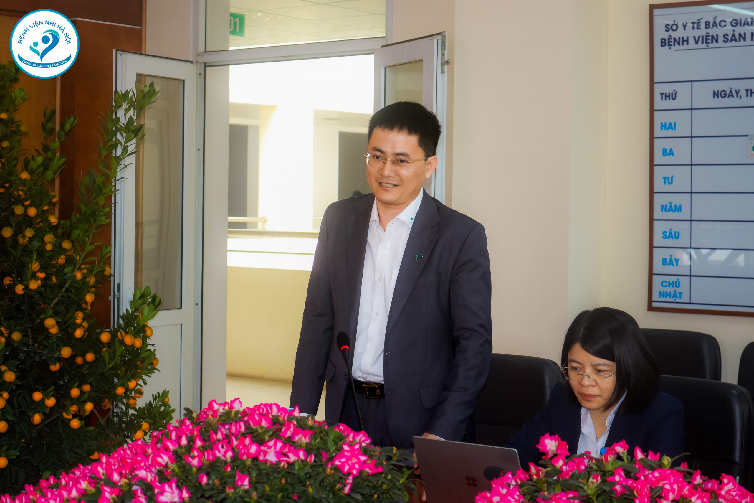 Đại diện Bệnh viện Sản Nhi Bắc Ninh Số 1 phát biểu chào mừng và giới thiệu tổng quan về quá trình phát triển, cơ cấu tổ chức cũng như định hướng chuyên môn của bệnh viện trong thời gian tới.