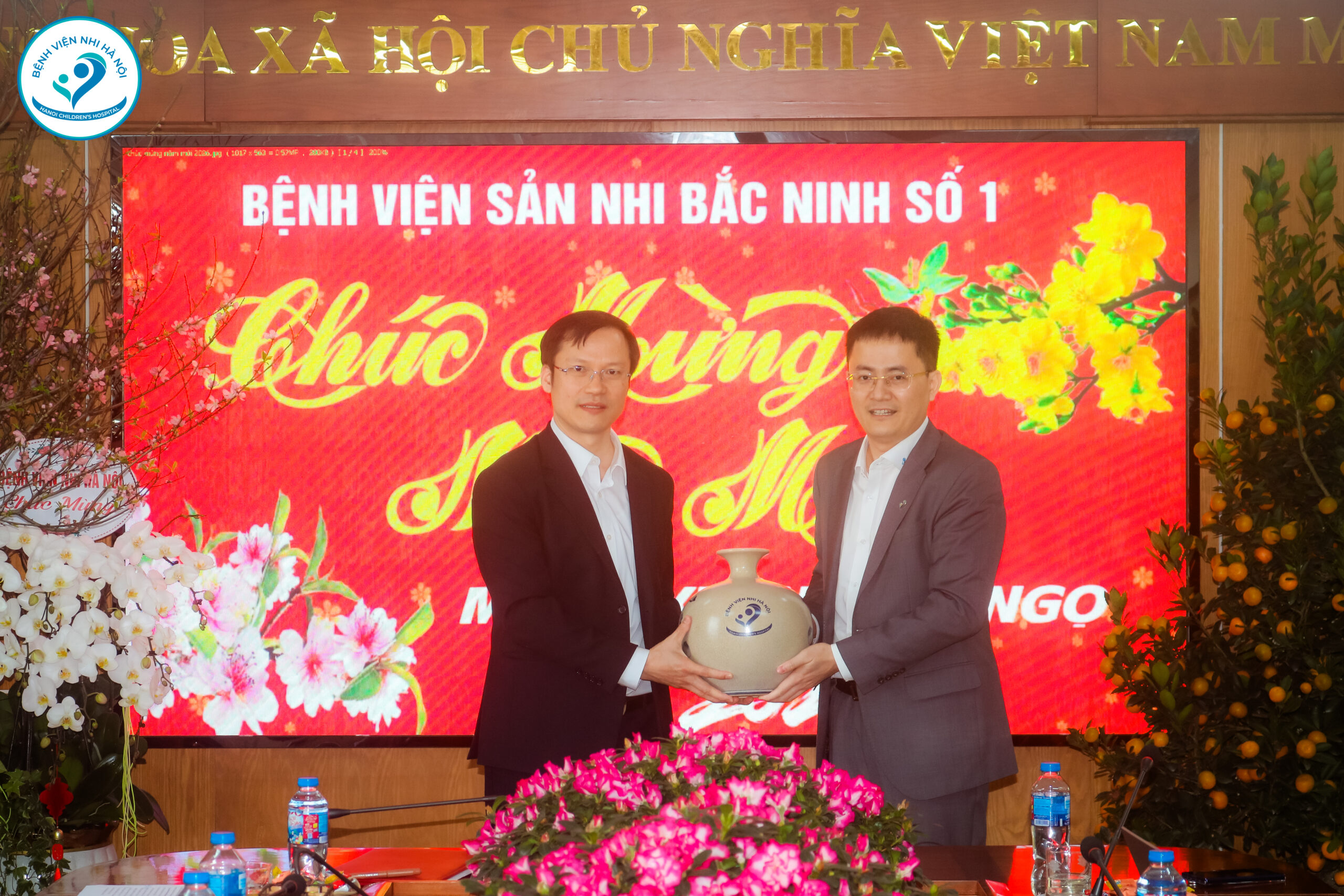 Nhân dịp này, đoàn công tác Bệnh viện Nhi Hà Nội đã trao tặng hoa chúc mừng BS.CKII. Hoàng Trường Giang nhân dịp nhận Quyết định bổ nhiệm Giám đốc Bệnh viện Sản Nhi Bắc Ninh Số 1, thể hiện sự trân trọng và tình cảm gắn bó giữa các đơn vị trong ngành y tế.