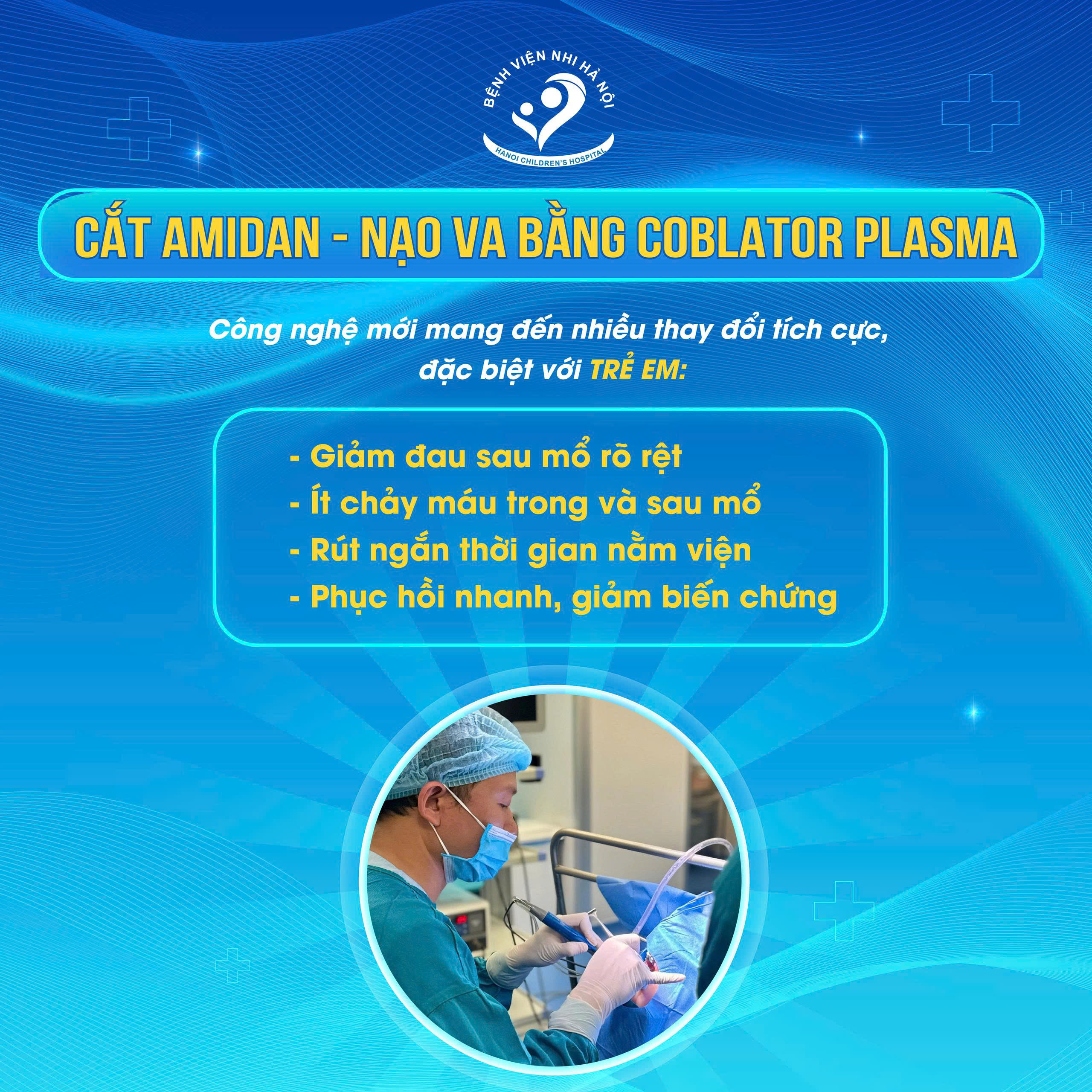 Tuy nhiên, hiện nay việc phẫu thuật ở trẻ tại Bệnh viện Nhi Hà Nội đã nhẹ nhàng hơn rất nhiều với công nghệ Coblator Plasma.