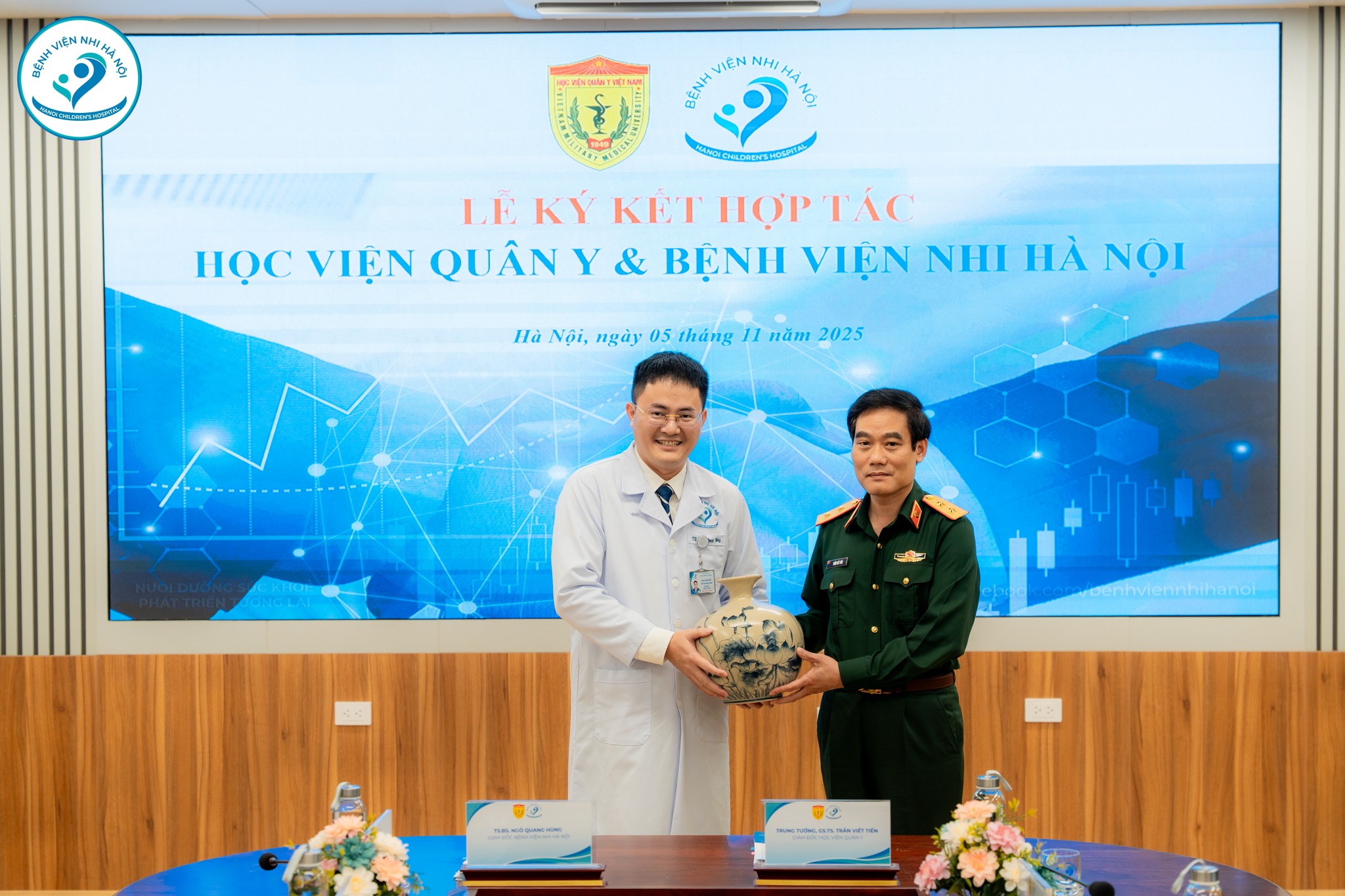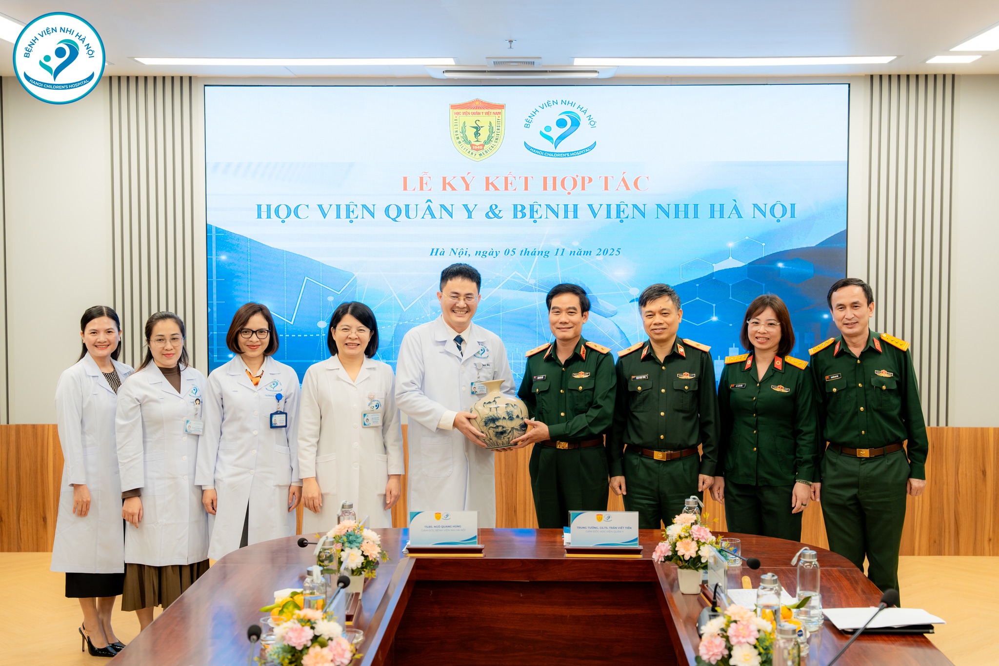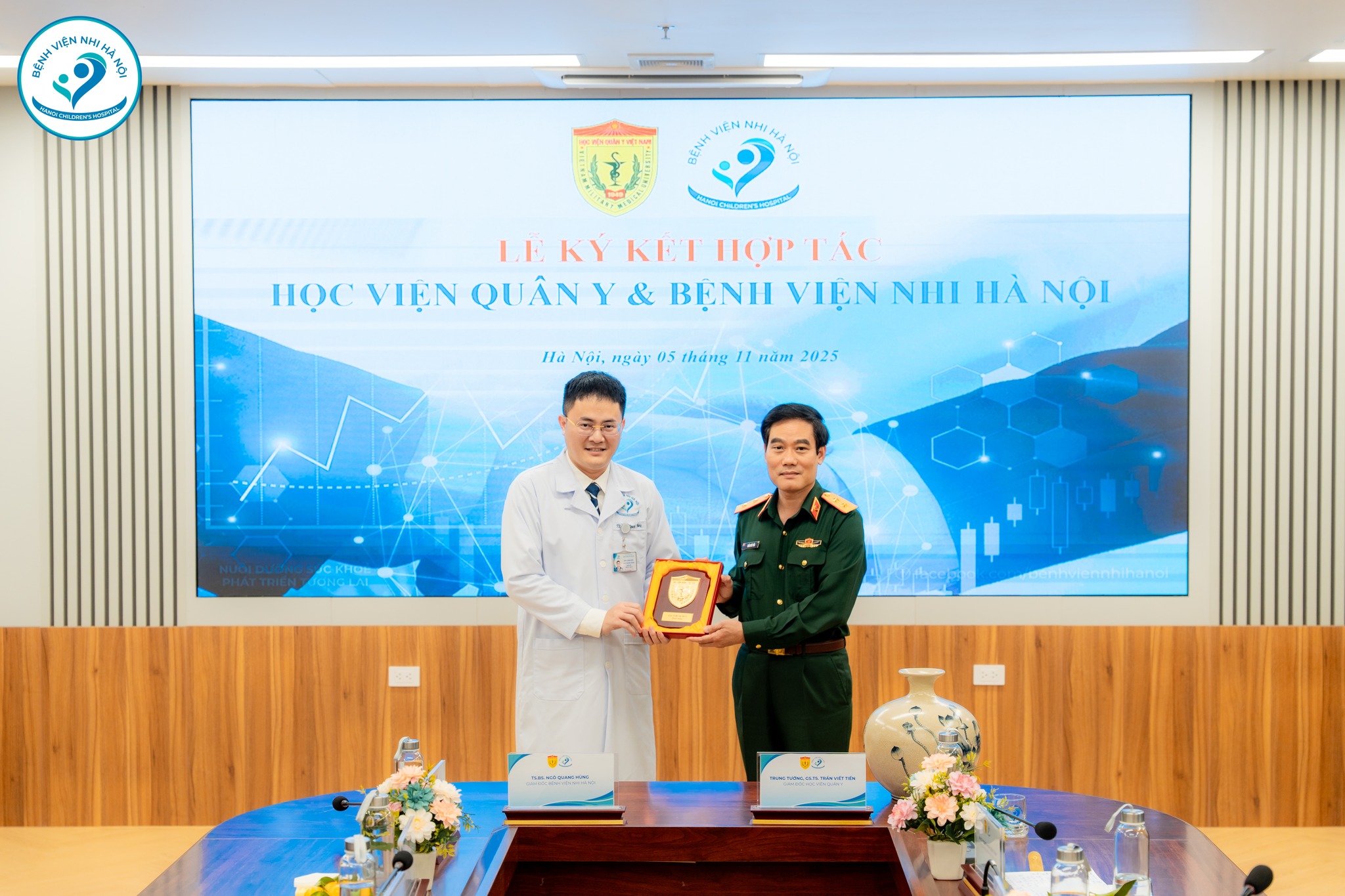 Chiều ngày 5/11/2025, tại hội trường Bệnh viện Nhi Hà Nội đã diễn ra Lễ ký kết Bản ghi nhớ thỏa thuận hợp tác và Hợp đồng nguyên tắc giữa Bệnh viện Nhi Hà Nội và Học viện Quân Y.