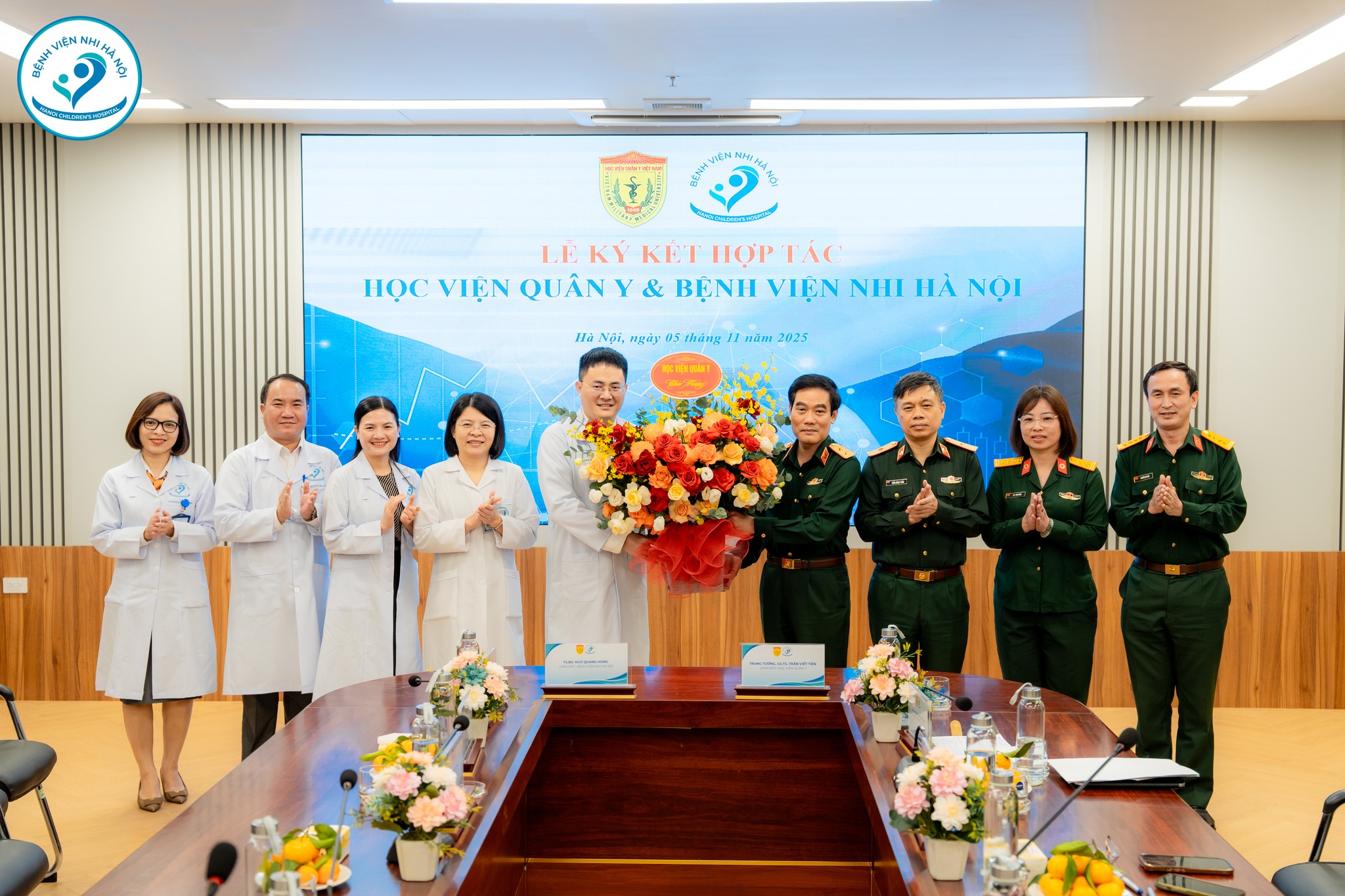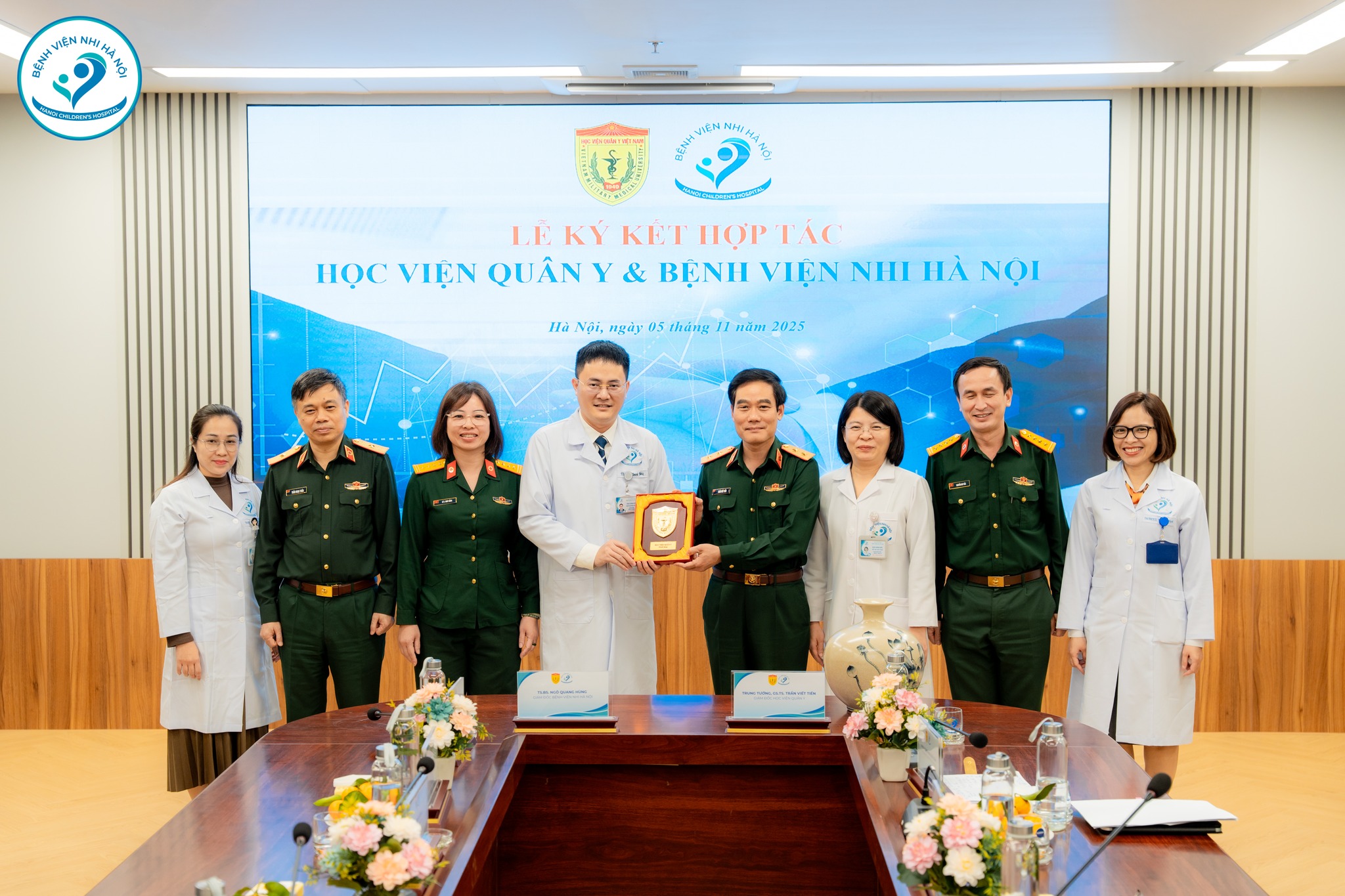 Chiều ngày 5/11/2025, tại hội trường Bệnh viện Nhi Hà Nội đã diễn ra Lễ ký kết Bản ghi nhớ thỏa thuận hợp tác và Hợp đồng nguyên tắc giữa Bệnh viện Nhi Hà Nội và Học viện Quân Y.