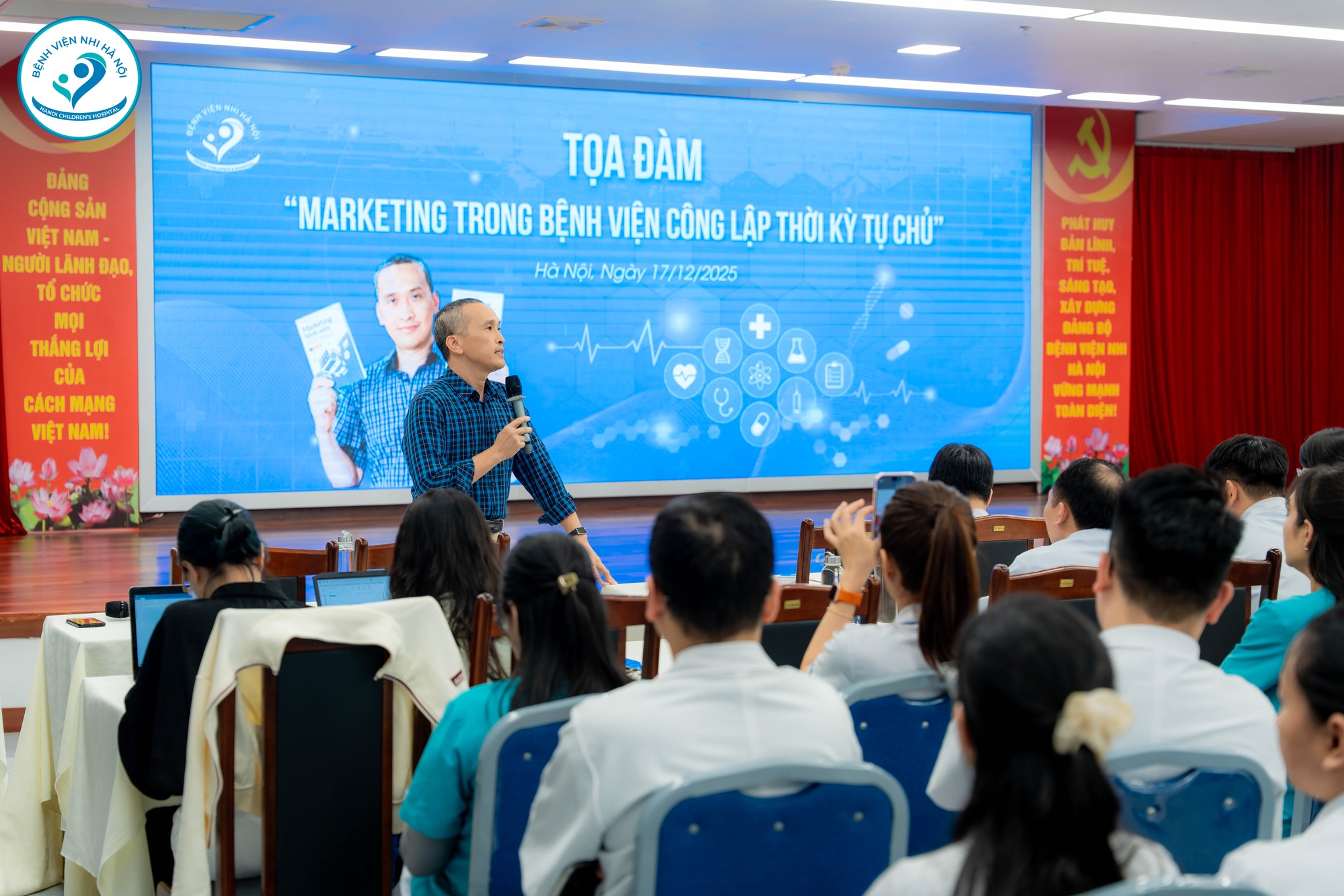 Tham dự chương trình có TS.BS Ngô Quang Hùng – Giám đốc, TS.BS Đỗ Thị Thúy Nga – Phó Giám đốc cùng đông đảo cán bộ, nhân viên y tế Bệnh viện Nhi Hà Nội. Tọa đàm vinh dự đón BS. Nguyễn Anh Hiệp – tác giả bộ sách “Marketing bệnh viện thực hành” – chủ trì và chia sẻ chuyên đề: “Marketing trong Bệnh viện Công lập thời kỳ tự chủ”.